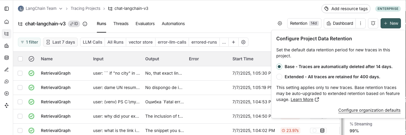 LangSmith has two trace tiers: base traces and extended traces. Base traces have the base retention and are short-lived (14 days), while extended traces have extended retention and are long-lived (400 days). For more information, refer to the data retention conceptual docs. Set the desired default trace tier by selecting an option below the Default data retention label. All traces will have this tier by default when they are registered. Note that because extended traces cost more than base traces, selecting Extended as your default data retention option will result in less overall traces allowed in the billing period. By default, updating this setting will only apply to future incoming traces. To apply to all existing traces in the workspace, select the checkbox. If the default data retention is set to Base you can optionally use the slider to distribute trace limits across base and extended tracess. LangSmith automatically provides a suggestion for this distribution but you can tailor this to your needs. For example, if you are running lots of automations or other features that may upgrade a trace to extended, you may want to increase your extended trace limits. To see the complete list of features that may upgrade a trace, see here.The extended data retention limit can cause features other than tracing to stop working once reached. If you plan to use this feature, read more about its functionality and side effects.