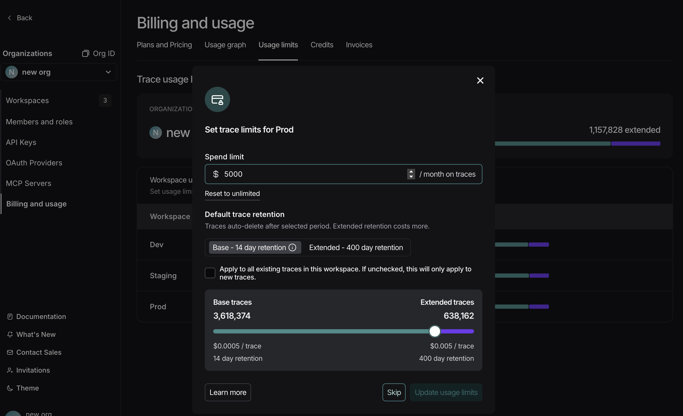 - Input a spend limit for your selected workspace. LangSmith will determine an appropriate number of base and extended trace limits to match that spend. The trace limits include the free trace allocation that comes with your plan (see details on pricing page).
